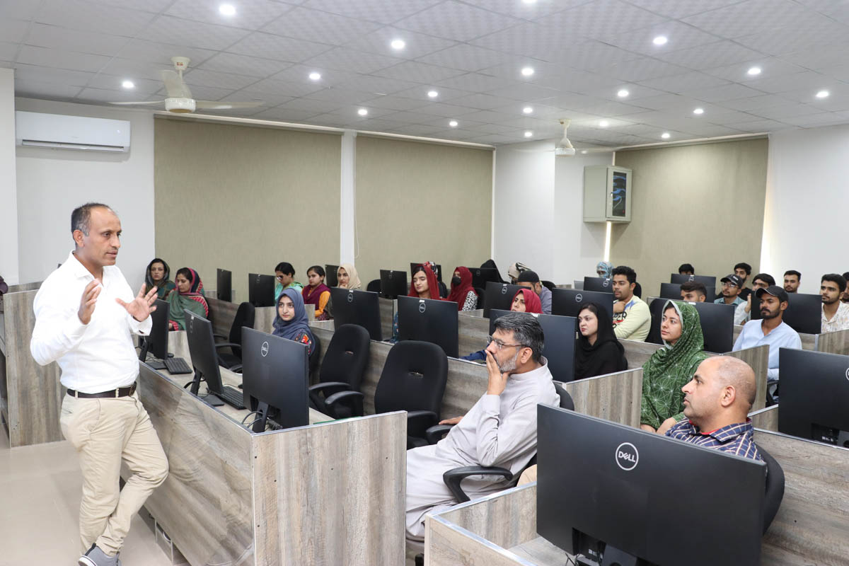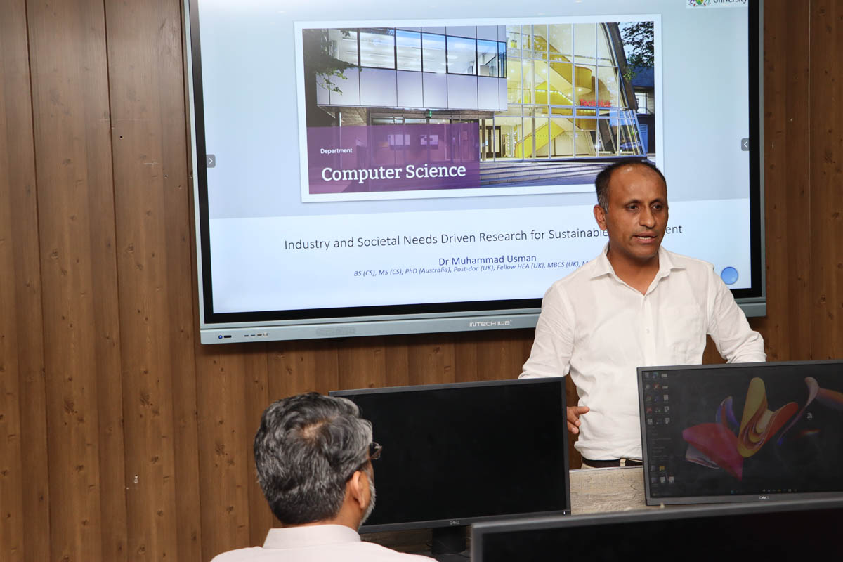 Department of Computer Science conducted the first Faculty Development Program (FDP) session titled "Faculty Excellence and Industry-Societal Needs Driven Research for Sustainable Development" on 10 August 2023. This session aims to enhance faculty members' skills, knowledge, and understanding to effectively cater to industrial and societal needs through research and academic excellence. A distinguished foreign faculty member, Mr. Muhammad Usman, an expert in Cyber Security and Digital Forensics, Edge Hill University, divided the discussion into two main segments. The first segment, Faculty Excellence Program, focused on strategies to enhance faculty excellence by adopting Effective Teaching Methodologies, especially student-centric teaching approaches like active learning, flipped classrooms, and technology integration, to engage and empower students in their learning process. Moreover, he also stressed the importance of fostering a mentor-mentee relationship with students to provide academic guidance, career counseling, and personal support. The second segment, Industry-Societal Needs-Driven Research for Sustainable Development, delved into the role of research to address industrial and societal needs for sustainable development. He guided faculty members to identify research areas aligned with the current needs of industries and society and emphasized the importance of interdisciplinary collaboration to tackle complex challenges.