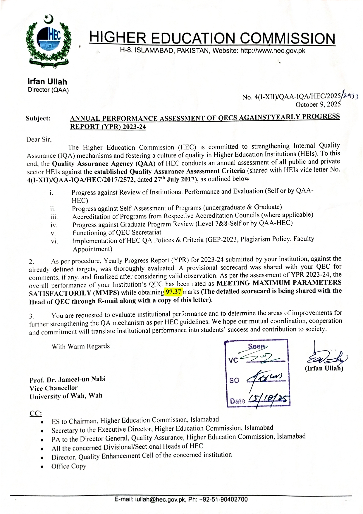 The Higher Education Commission praised the University of Wah for its consistent efforts to enhance internal quality mechanisms and promote a lasting culture of continuous improvement in higher education. This acknowledgment highlights the University’s firm adherence to HEC’s quality assurance standards and its sustained dedication to excellence in education, research, and community engagement.