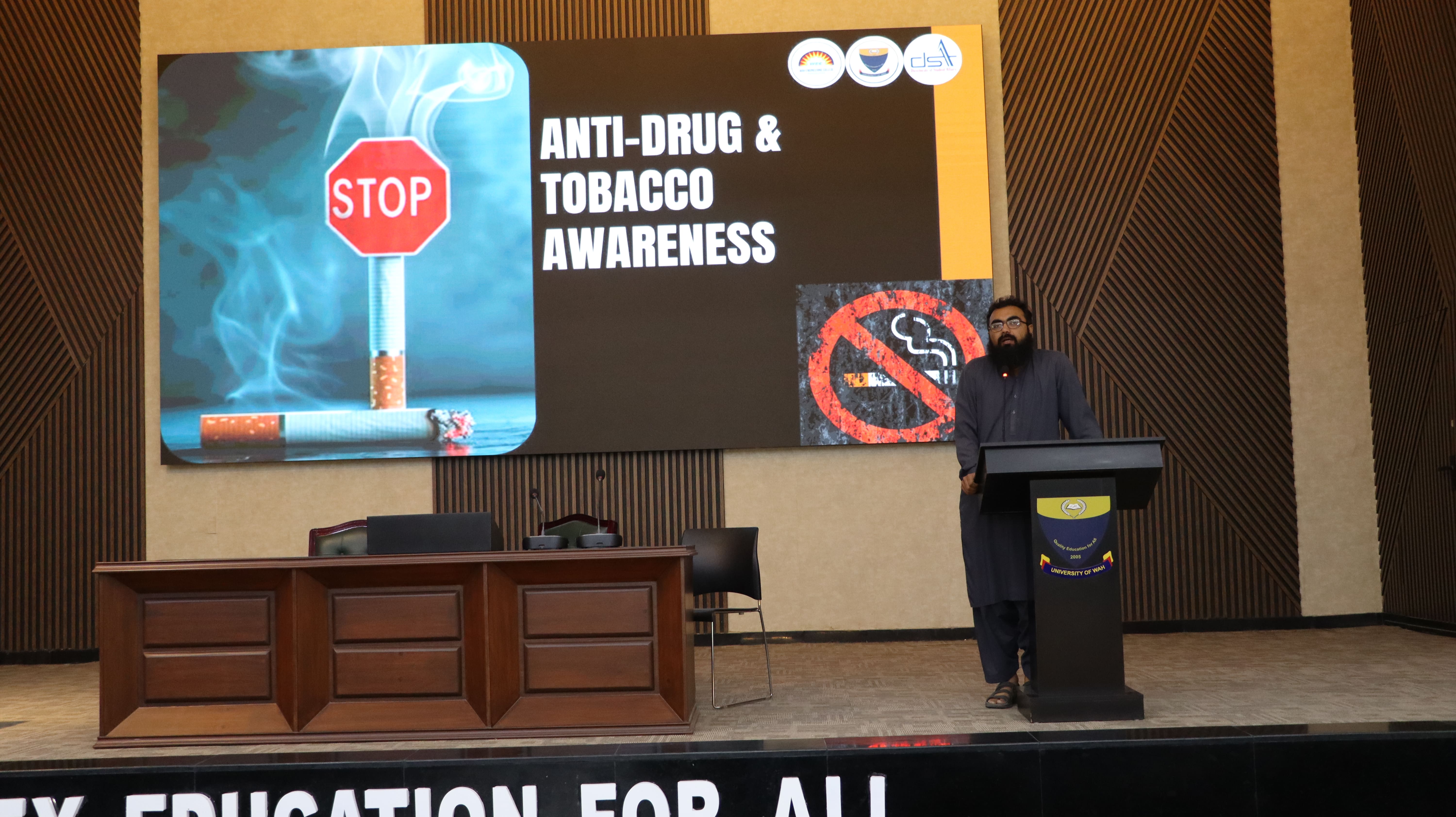The Office of Student Affairs, University of Wah, organized a seminar on Anti-Drug and Tobacco Awareness on 10 November 2025, featuring Mr. Maaz Ahmed, lecturer, Department of Psychology, focal person for the Anti-Drug and Tobacco campaign, as the guest speaker. The session aimed to educate students and faculty on the harmful effects of drug and tobacco use and promote a drug-free, healthy lifestyle on campus. Mr. Maaz highlighted the physical, psychological, and social impacts of addiction and shared strategies for prevention and rehabilitation. The seminar drew active participation from students and faculty and concluded with a pledge to uphold a drug- and tobacco-free university environment.