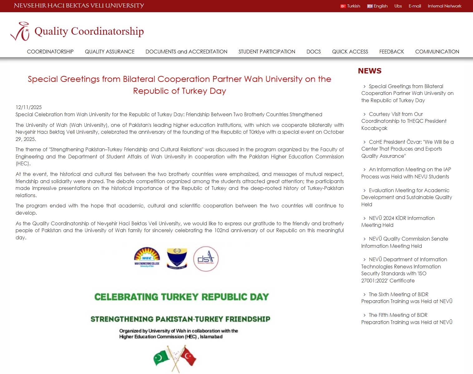 University of Wah (UW) extends its sincere felicitations to the Government and the people of the Republic of Türkiye on the auspicious occasion of the 102nd Republic Day. UW highly appreciates Nevşehir Hacı Bektaş Veli University for organizing a special event to commemorate this historic milestone and for acknowledging the enduring friendship, cultural affinity, and academic collaboration between Pakistan and Türkiye.