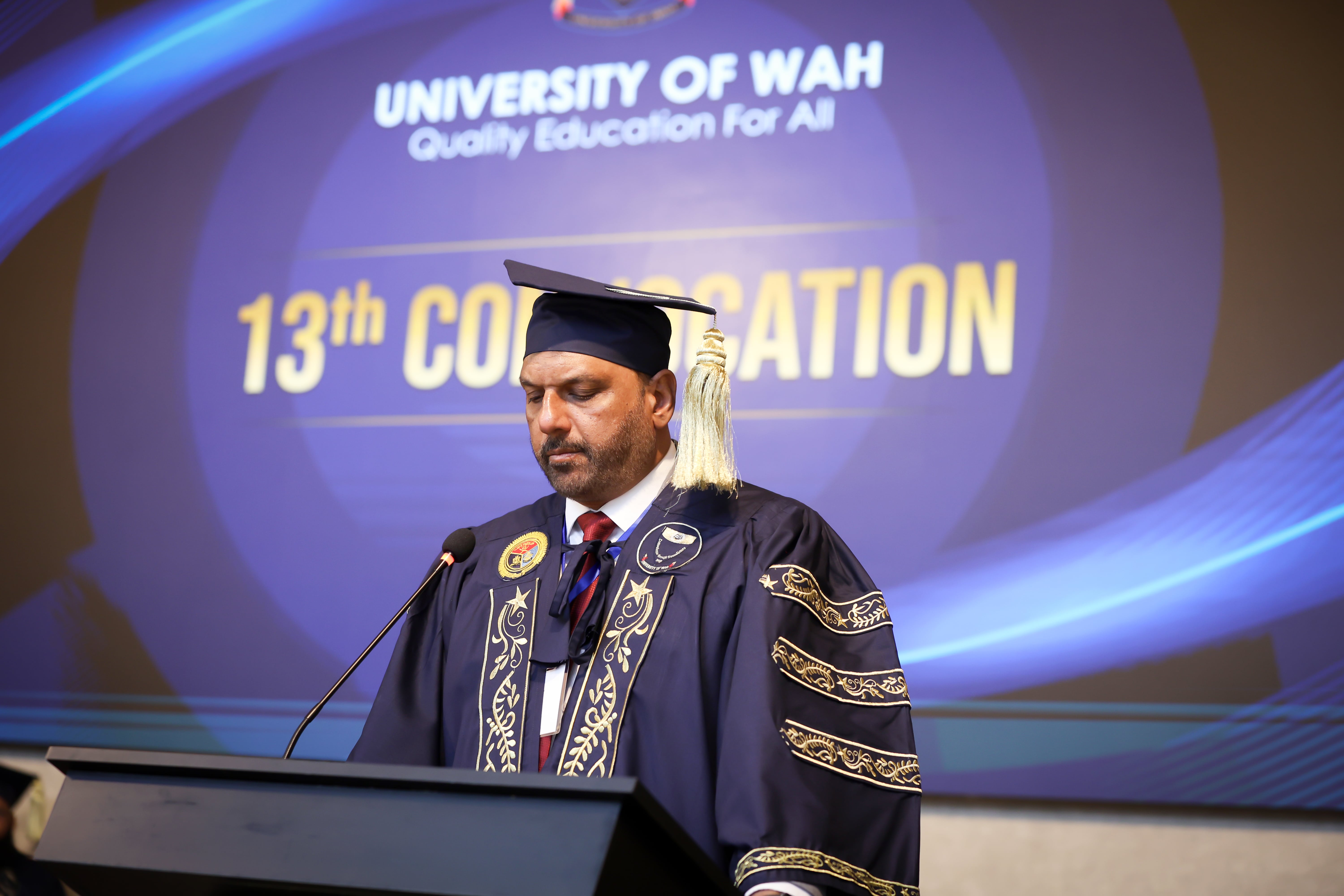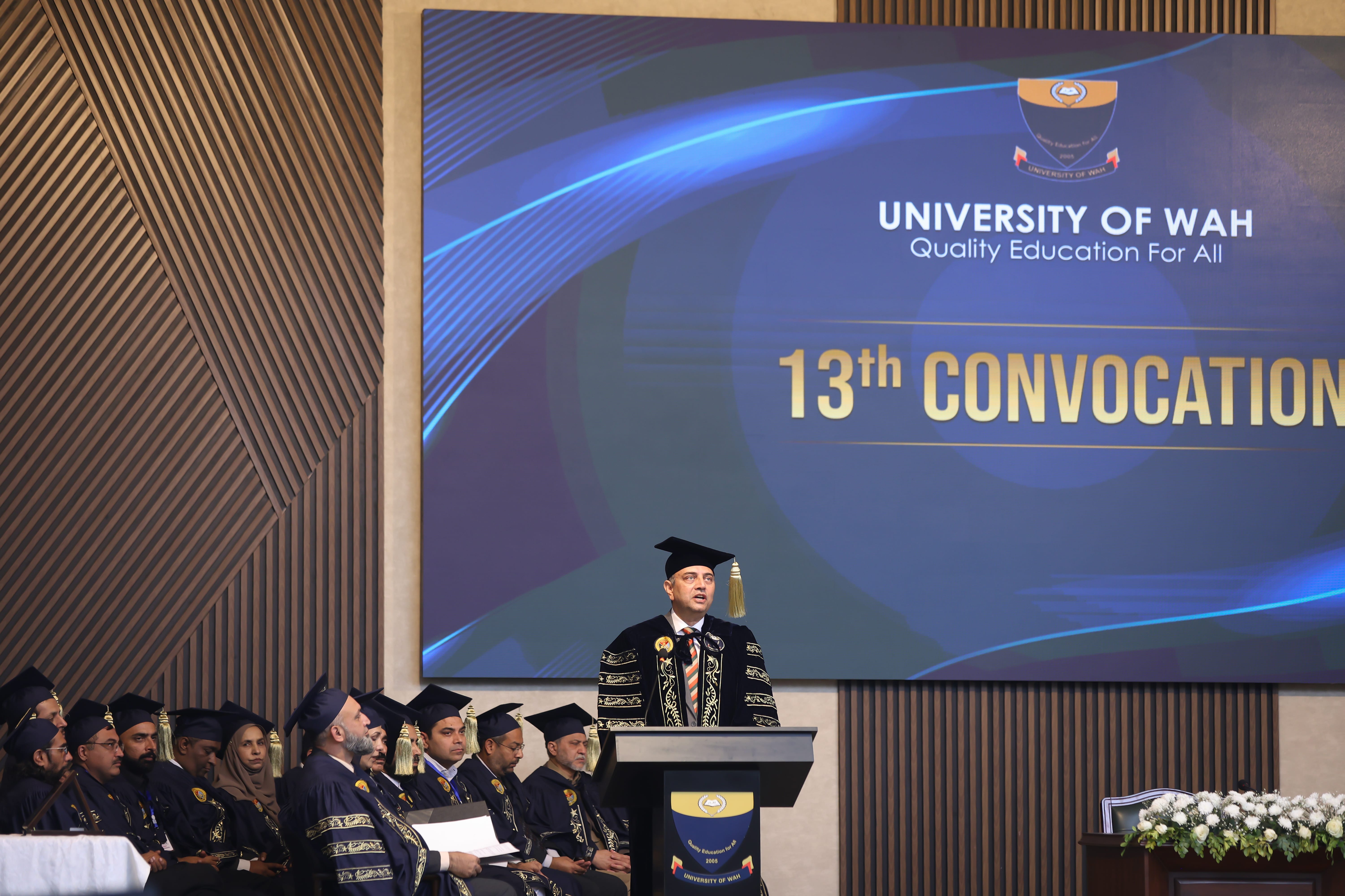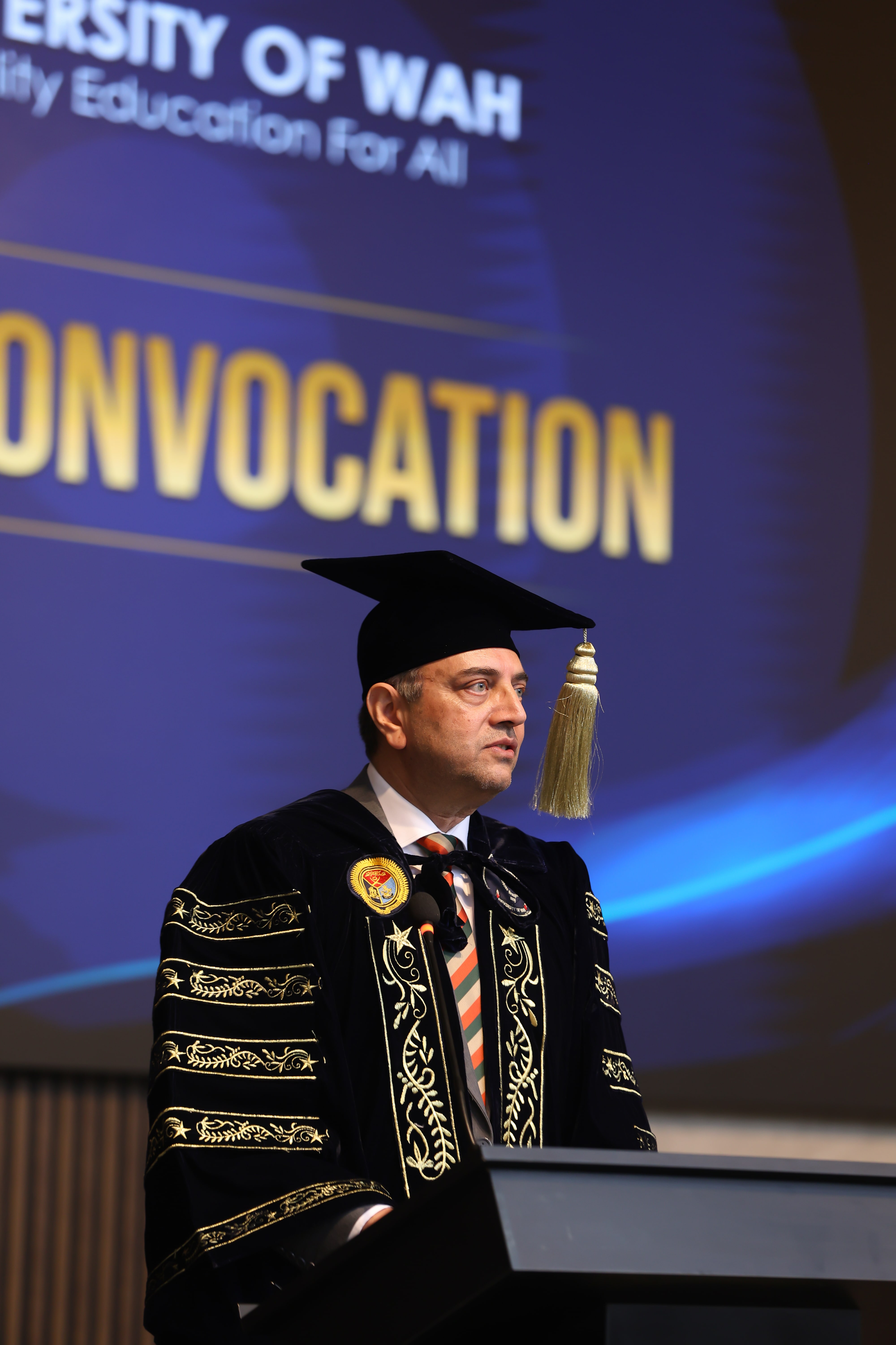 In his address, the Chief Guest congratulated the graduates on their academic success and urged them to use their knowledge, skills, and values to promote Pakistan's prosperity and serve humanity. He commended the University of Wah for its progress in research, modernization, and strengthening academia-industry linkages. Appreciating the contributions of faculty and parents in shaping future leaders, he encouraged graduates to pursue lifelong learning and contribute responsibly as ambassadors of their alma mater.