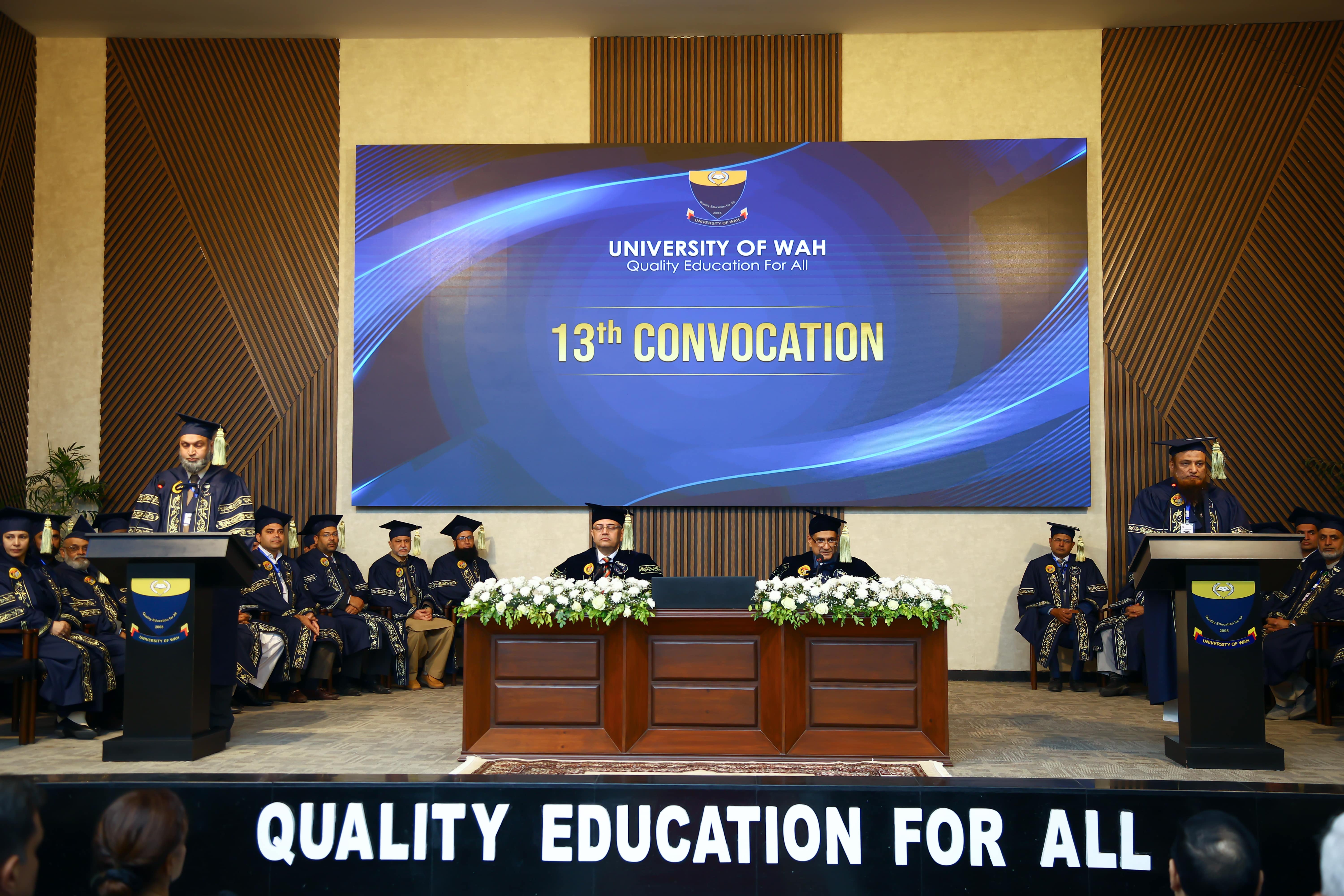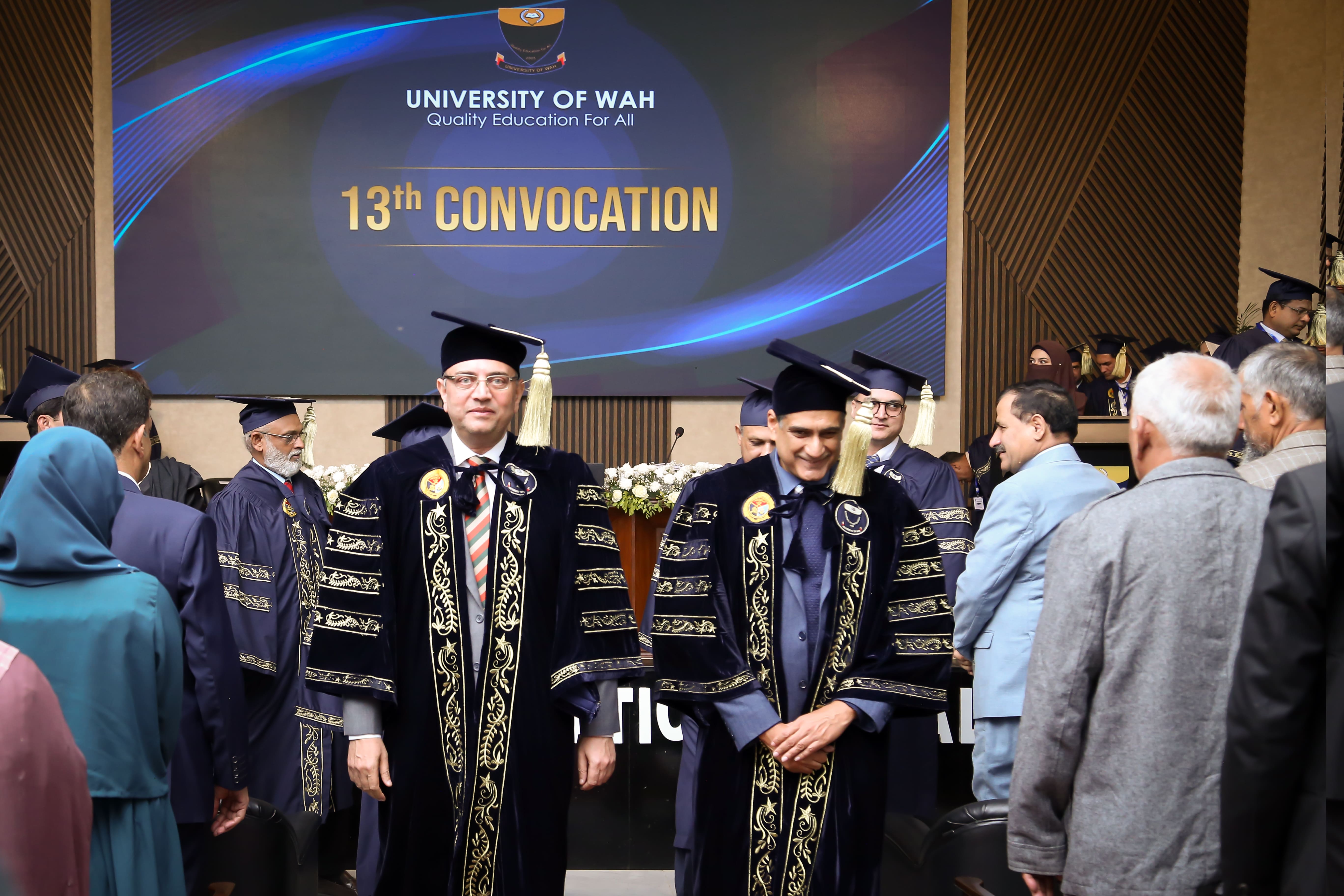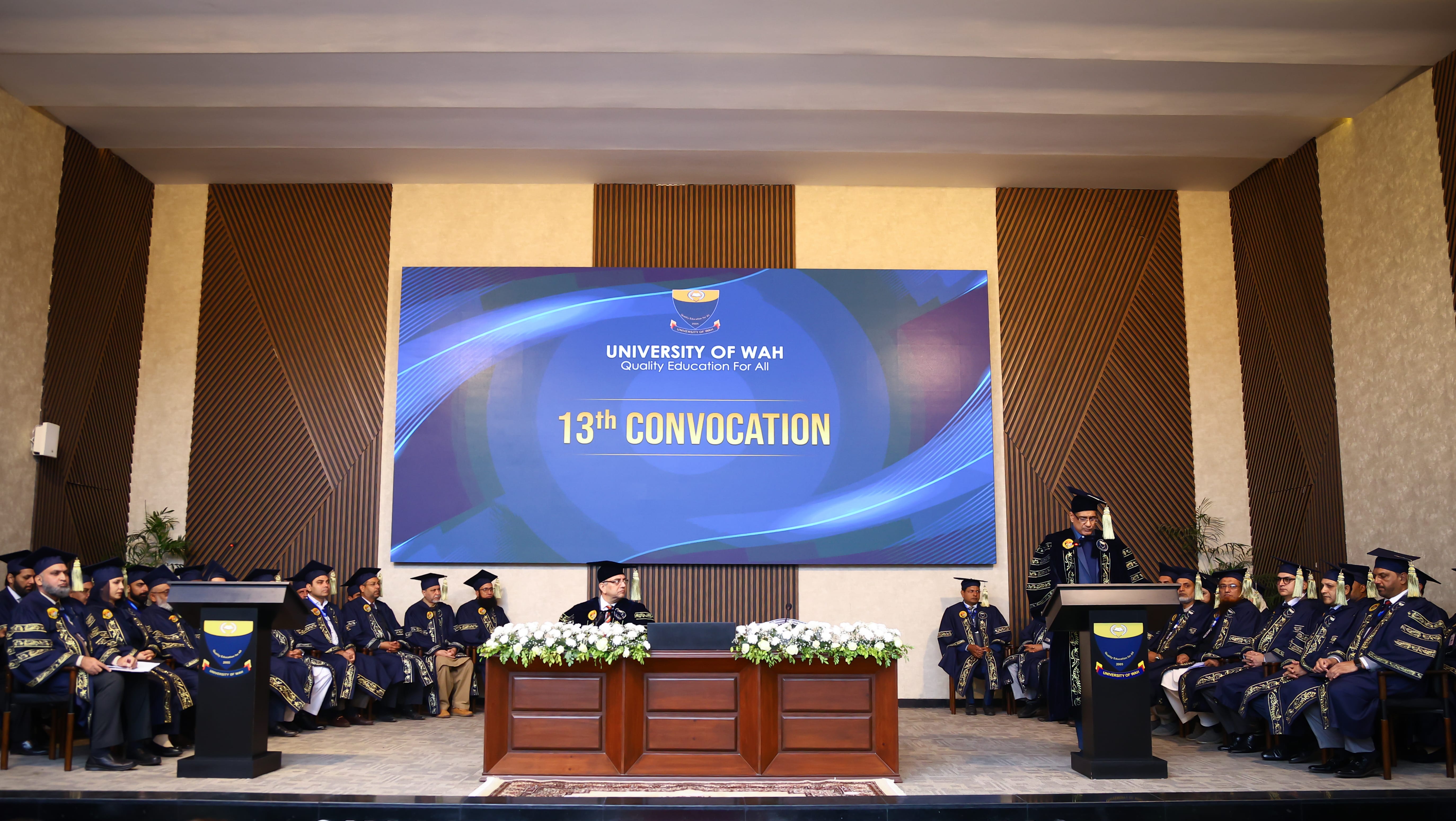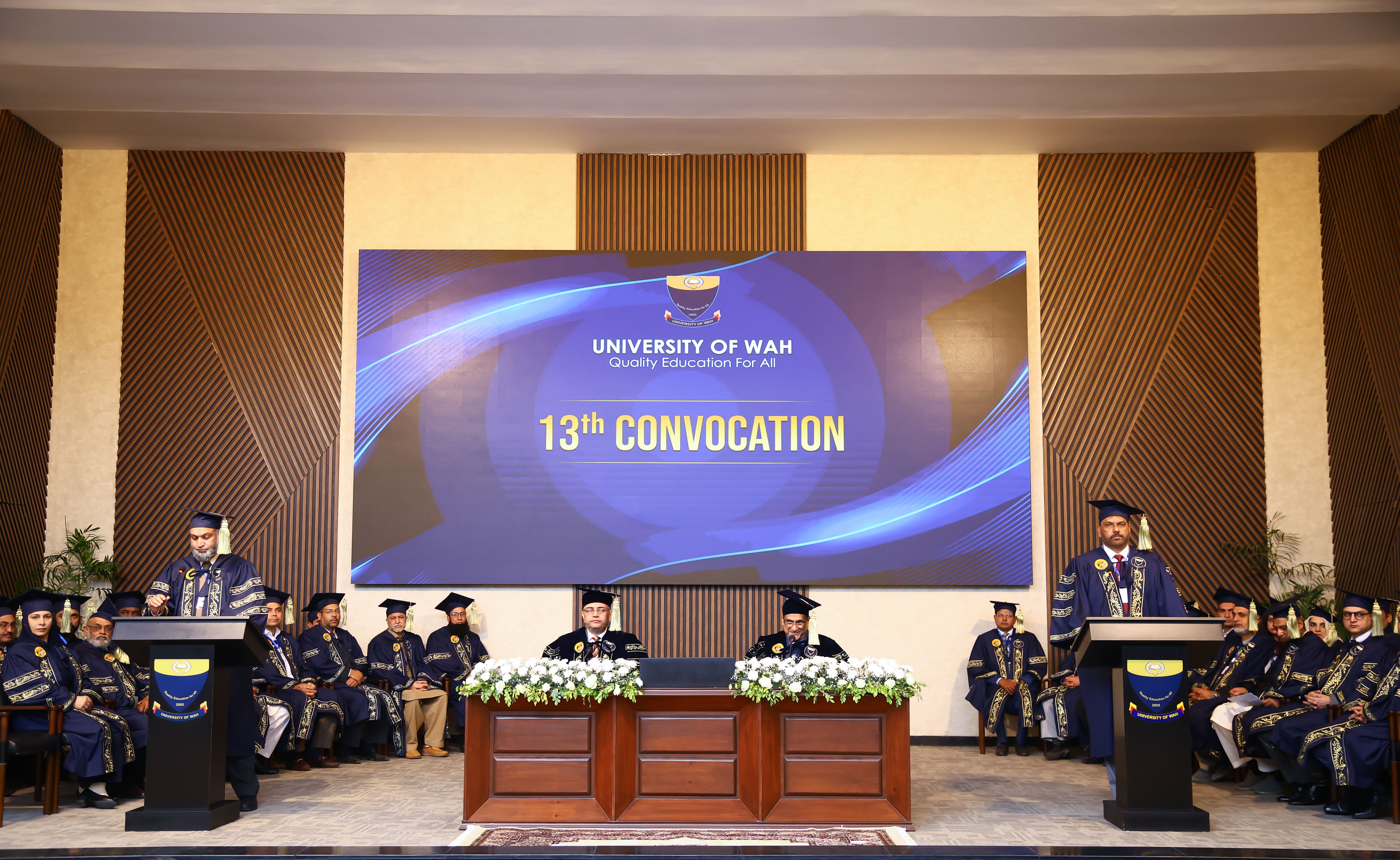 University of Wah (UW) held its 13th Convocation on Thursday, 27 November 2025, at UW Auditorium, marking a momentous milestone in celebrating the achievements, dedication, and perseverance of its graduating students. Major General Muhammad Kashif Azad, HI (M), Director General (Commercial), Pakistan Ordnance Factories, Wah Cantt, graced the occasion as the Chief Guest. The ceremony was attended by renowned academicians, senior officials, faculty members, industry representatives, graduates, and their proud families. For the first time in the history of University of Wah, 9 students received their Doctor of Philosophy degrees. In addition, 312 MS and 880 BS students graduated from UW in 2025.