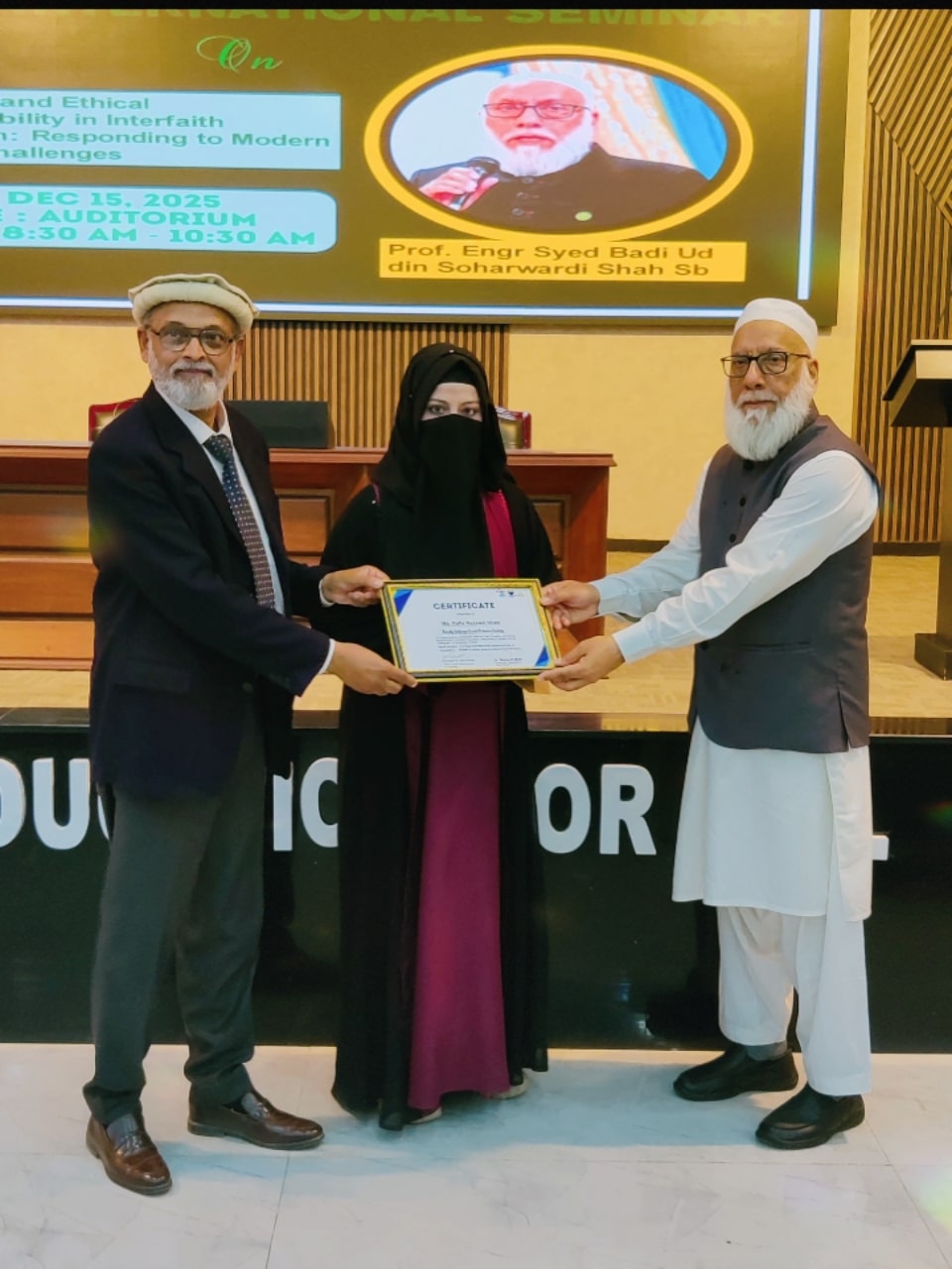 Syed Badi Ud Din Soharwardi Shah from Canada, who delivered the keynote address, emphasized the importance of interfaith education in fostering empathy, mutual respect, and ethical responsibility. He highlighted contemporary challenges such as intolerance, extremism, and moral disintegration, noting that these can be addressed through dialogue and shared human values.