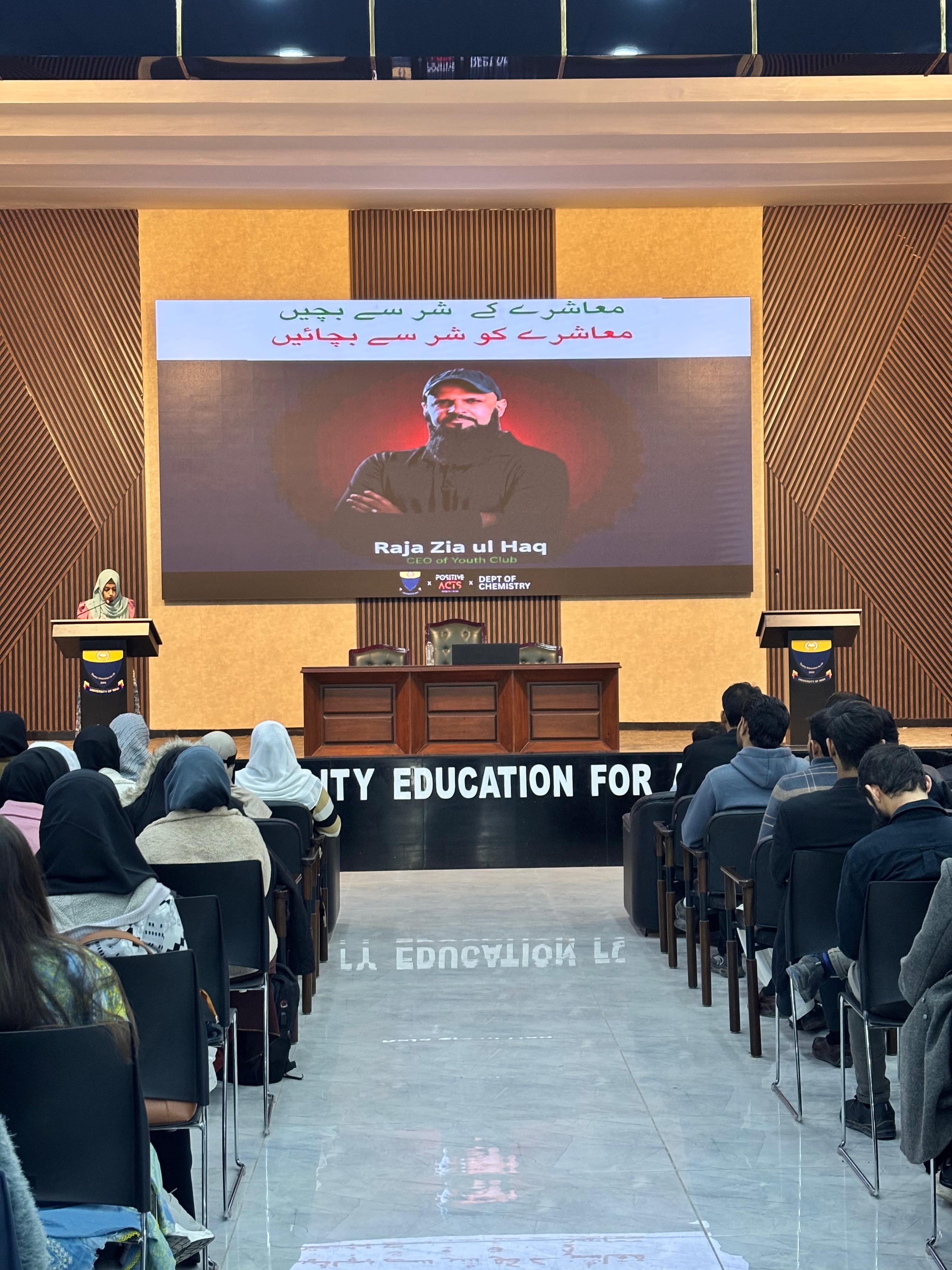 Department of Chemistry, under the supervision of Chairperson Dr. Humaira Razzaq, organized a motivational talk in collaboration with Positive Acts on 29 January 2026. The session aimed to instill strong social and ethical values among students and featured Mr. Raja Zia ul Haq, CEO of Youth Club, as the keynote speaker.