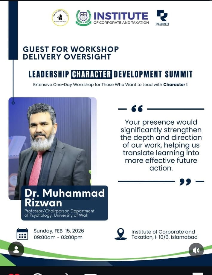 Prof. Dr. Muhammad Rizwan, Chairperson, Department of Psychology, University of Wah, attended the Leadership Character Development Summit as a guest speaker for Workshop Delivery Oversight on 15 February 2026. The summit was held at the Institute of Corporate and Taxation and organized in collaboration with The Project Suicide (TPS) and Rebirth Pakistan to strengthen Pakistan’s human infrastructure through psychosocial leadership development.