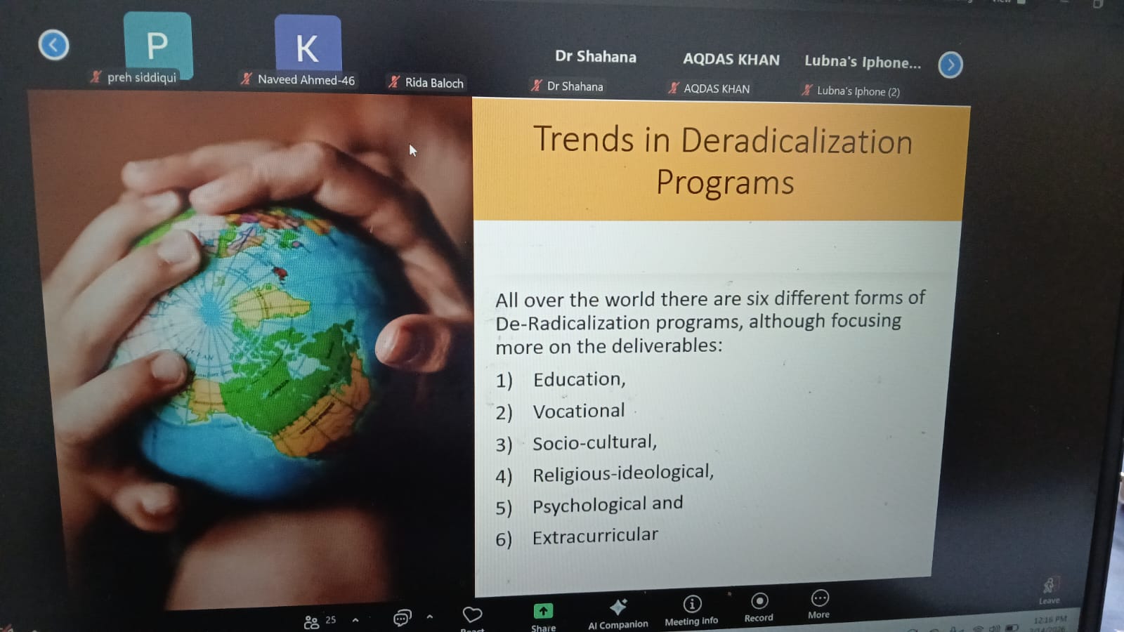 During the session, Prof. Rizwan critically examined contemporary psychological models of radicalization, including the Significance Quest Theory, the 3N Framework (Need, Narrative, Network), and Moghaddam’s Staircase Model, contextualizing them within the socio-cultural landscape of Pakistan. Participants engaged in in-depth discussions on identifying local “push and pull” factors, differentiating between disengagement and de-radicalization, and designing community-based interventions for the prevention of violent extremism (PVE).