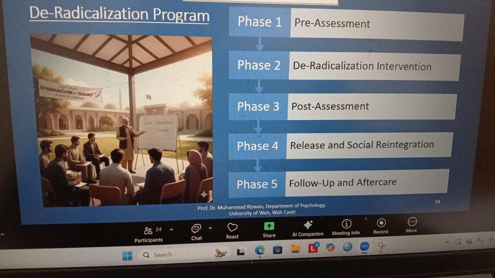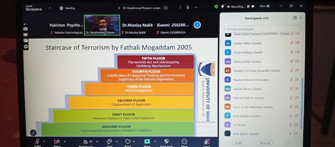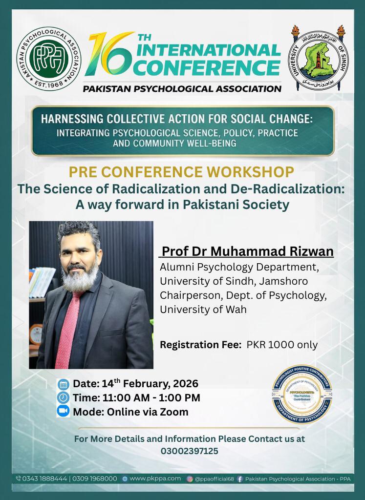 Prof. Dr. Muhammad Rizwan, Chairperson, Department of Psychology, University of Wah, conducted a pre-conference workshop titled “The Science of Radicalization and De-Radicalization: A Way Forward in Pakistani Society” on 14 February 2026 as part of the 16th International Conference of the Pakistan Psychological Association (PPA). The workshop was hosted online via Zoom by University of Sindh in alignment with the conference theme of integrating psychological science, policy, practice, and community well-being.