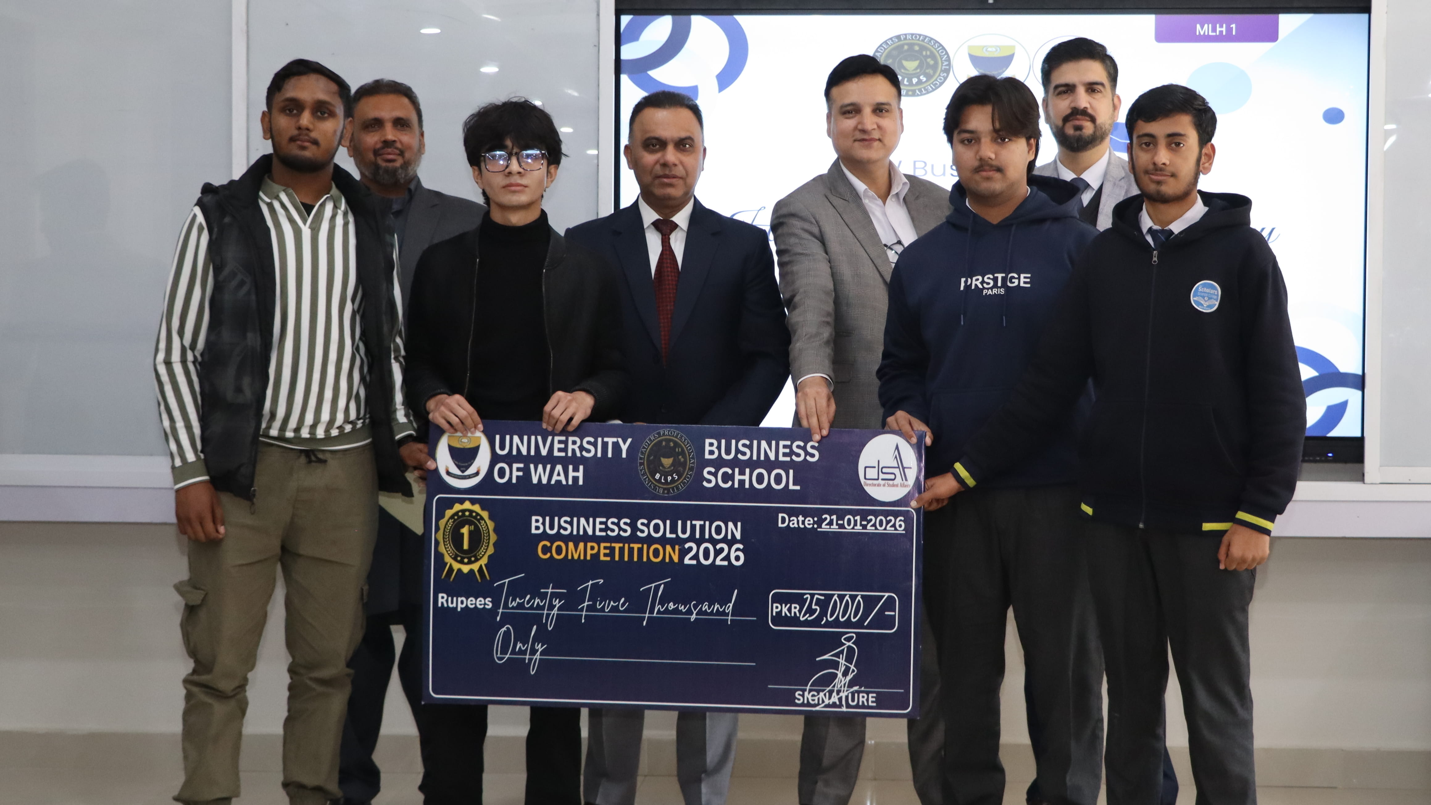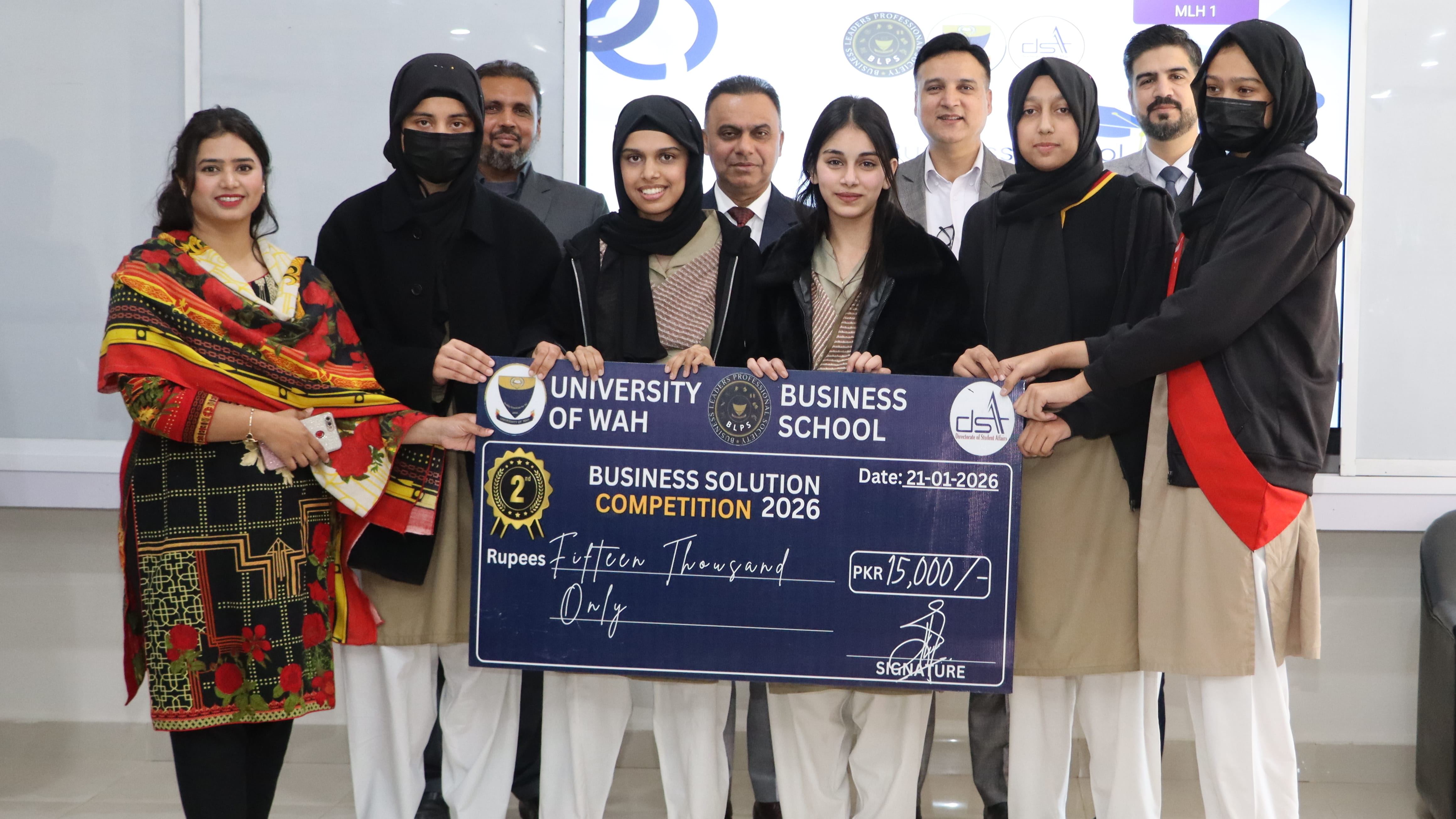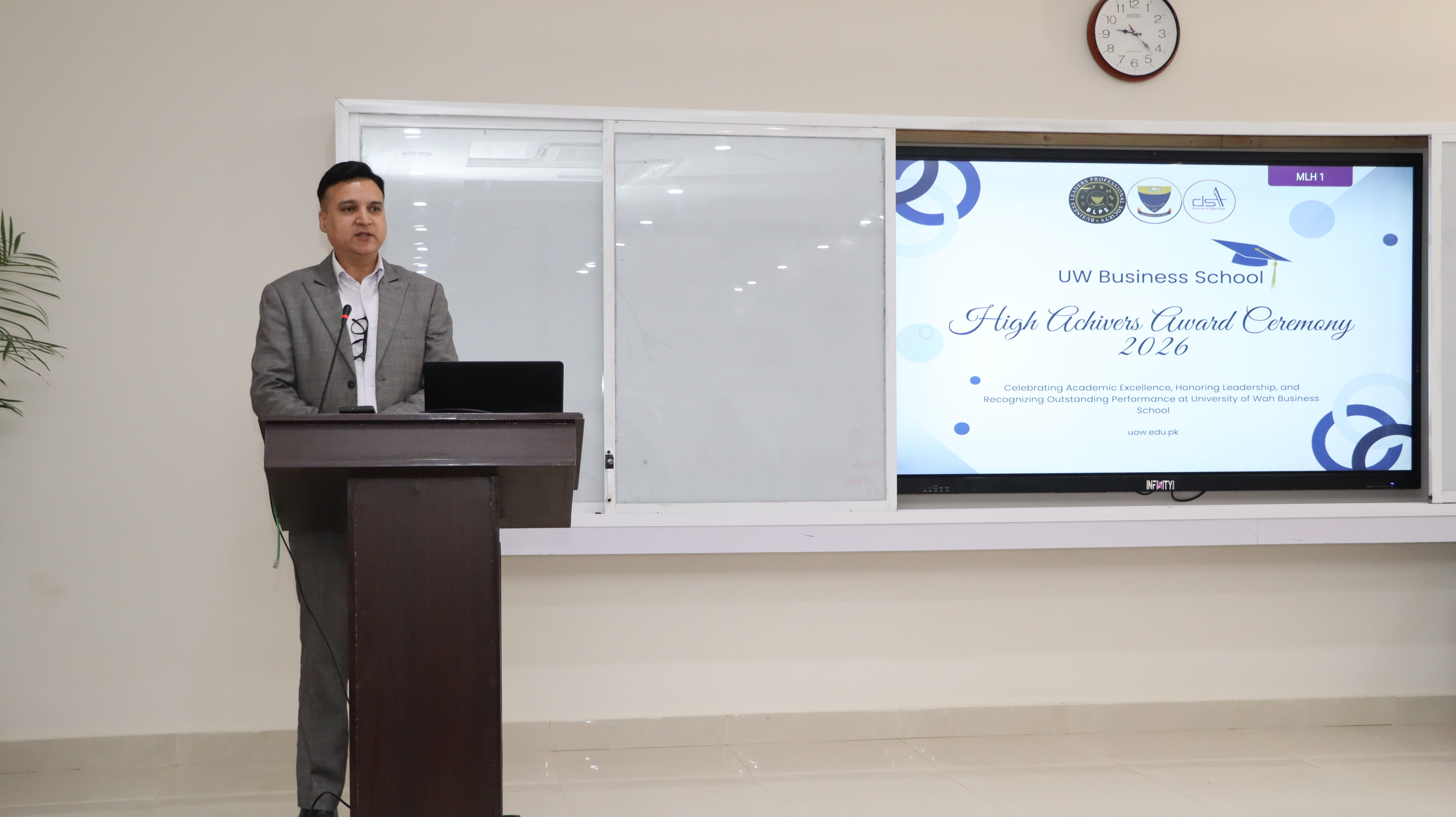 The High Achievers Award Ceremony (HAAC) and Business Solution Competition (BSC 2.0) Prize Distribution Ceremony was held on 13 February 2026 at Wah Business School, University of Wah. The prestigious event was graced by Muhammad Nawaz Jamali, General Manager of Direct Material Sourcing, SCM Department, Pakistan Ordnance Factories (POF), as the Chief Guest. He was accompanied by Sardar Aqsam, Advocate, High Court, Islamabad, along with Prof. Dr. Khurram Shahzad, Dean, Management Sciences, Chairperson, and faculty members of the department.