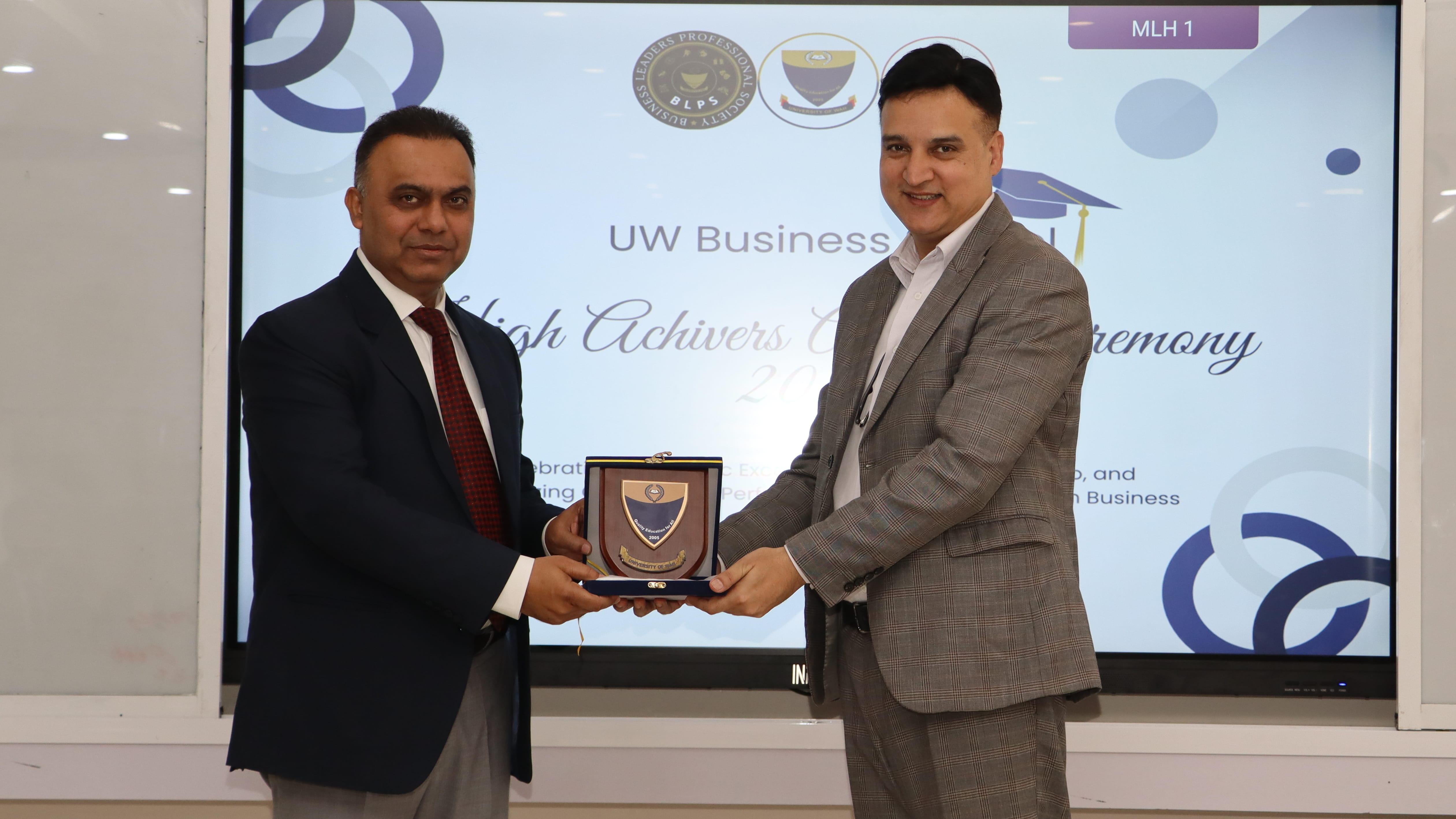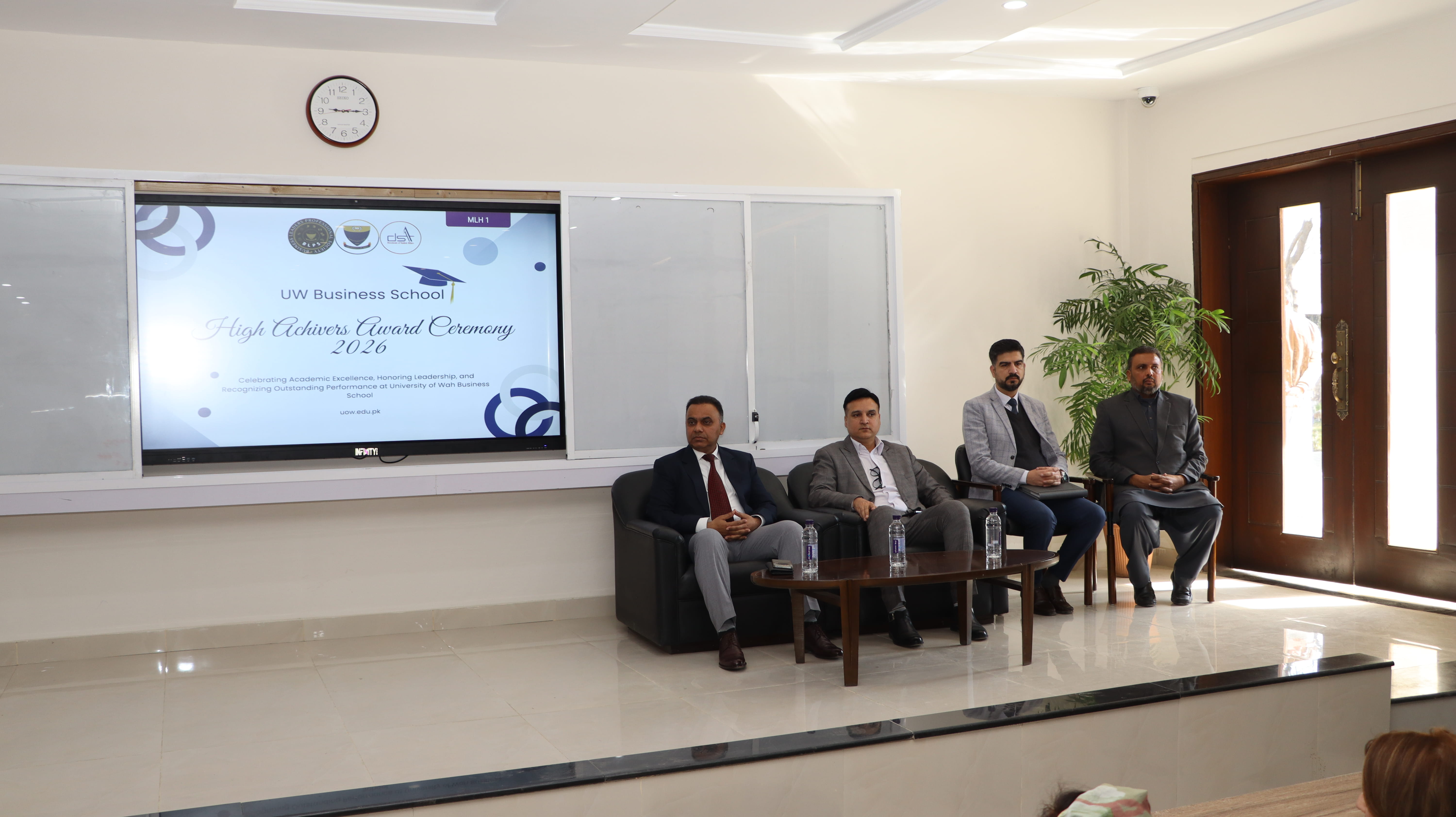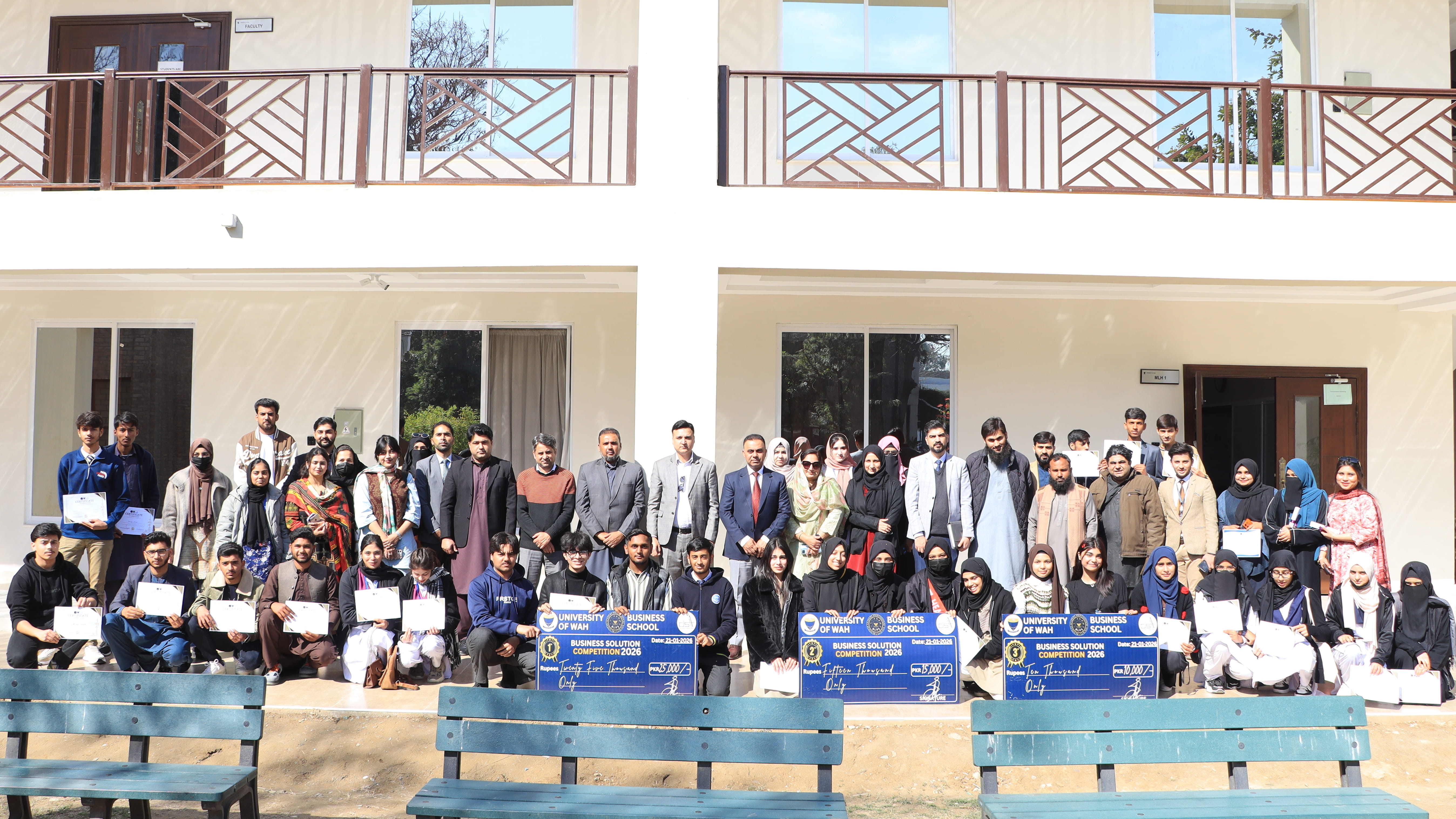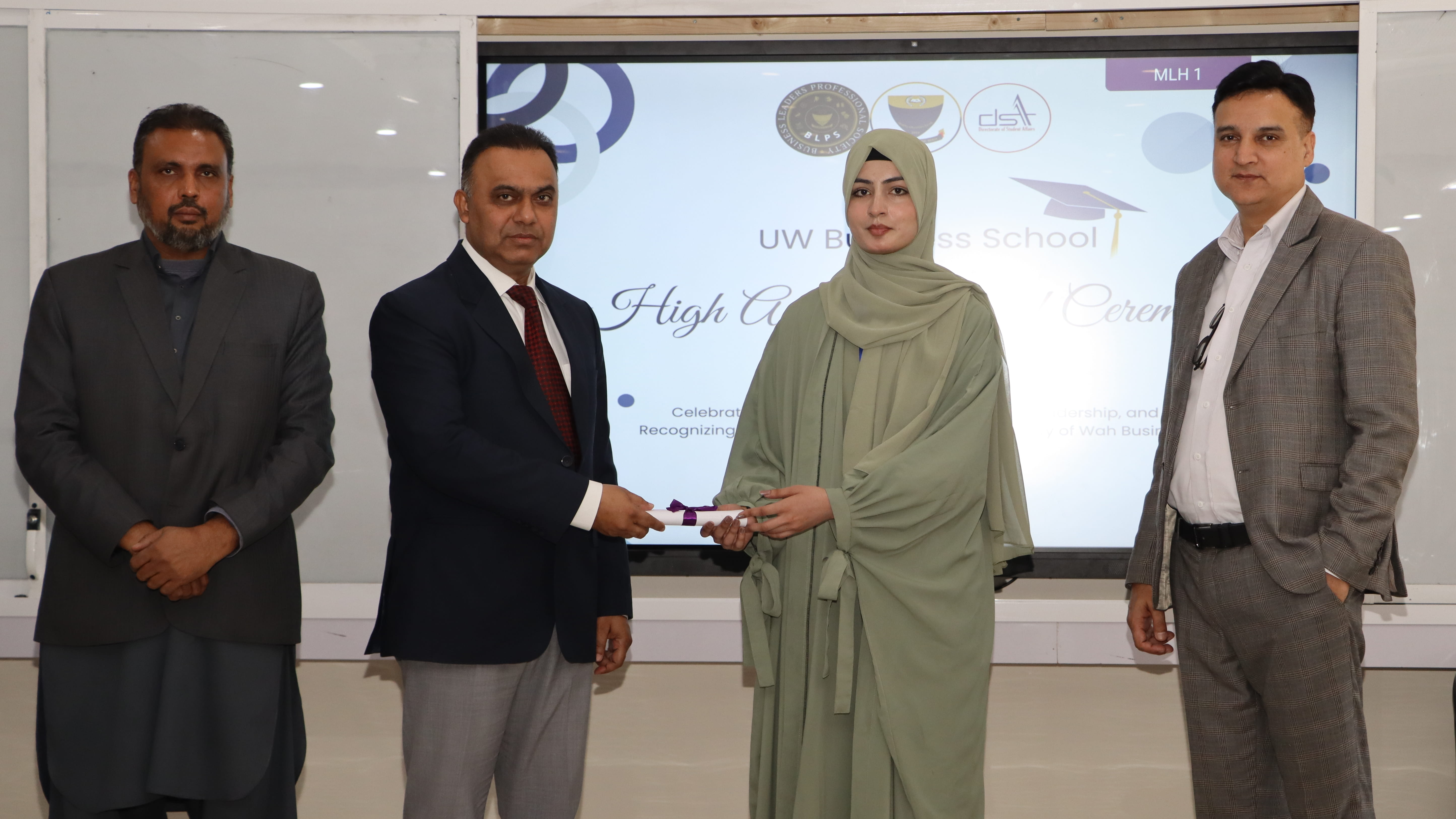 The High Achievers Award Ceremony (HAAC) and Business Solution Competition (BSC 2.0) Prize Distribution Ceremony was held on 13 February 2026 at Wah Business School, University of Wah. The prestigious event was graced by Muhammad Nawaz Jamali, General Manager of Direct Material Sourcing, SCM Department, Pakistan Ordnance Factories (POF), as the Chief Guest. He was accompanied by Sardar Aqsam, Advocate, High Court, Islamabad, along with Prof. Dr. Khurram Shahzad, Dean, Management Sciences, Chairperson, and faculty members of the department.