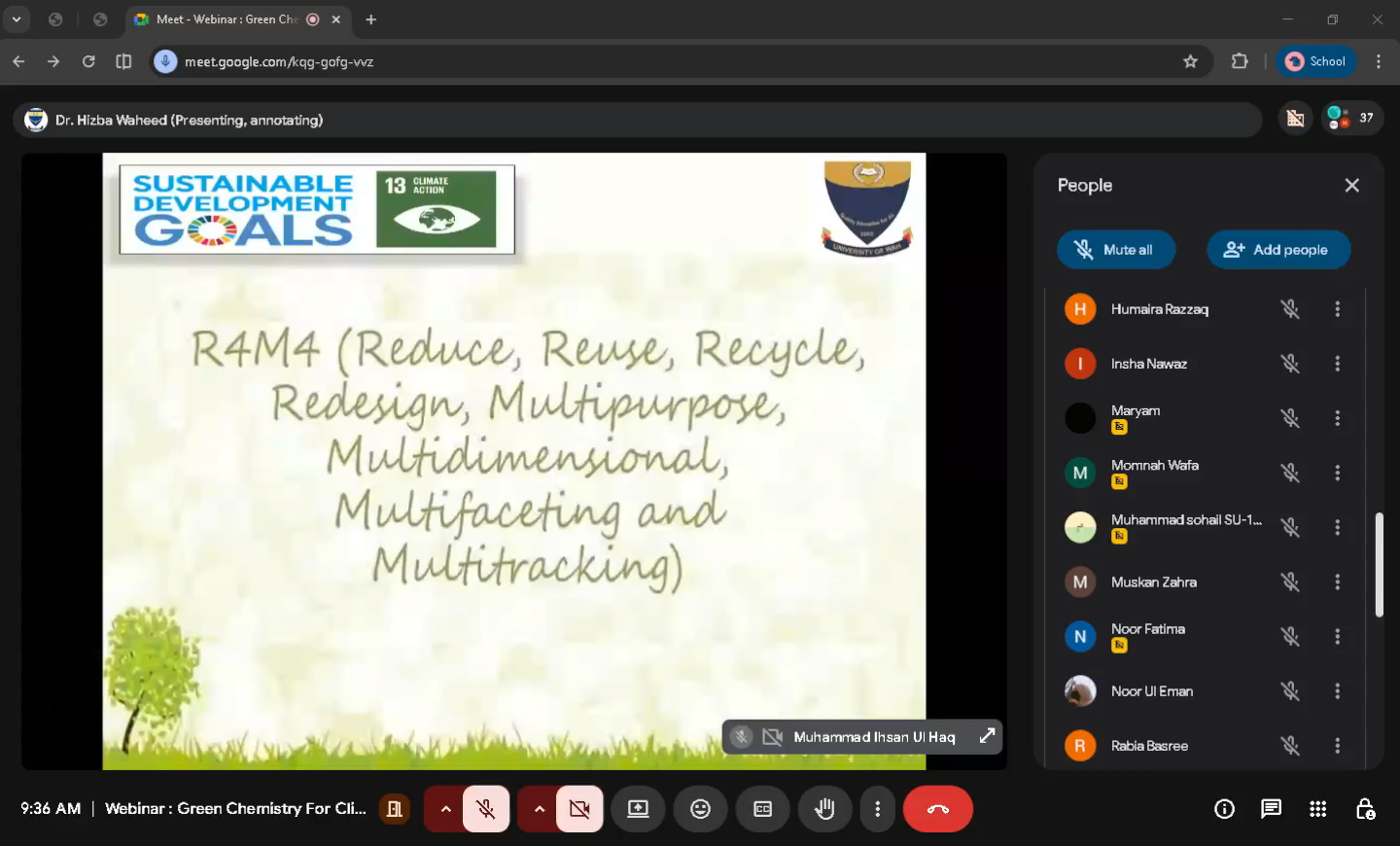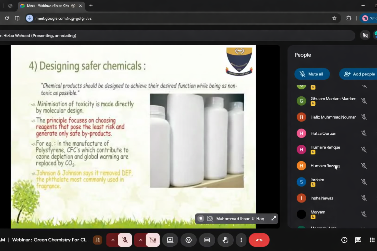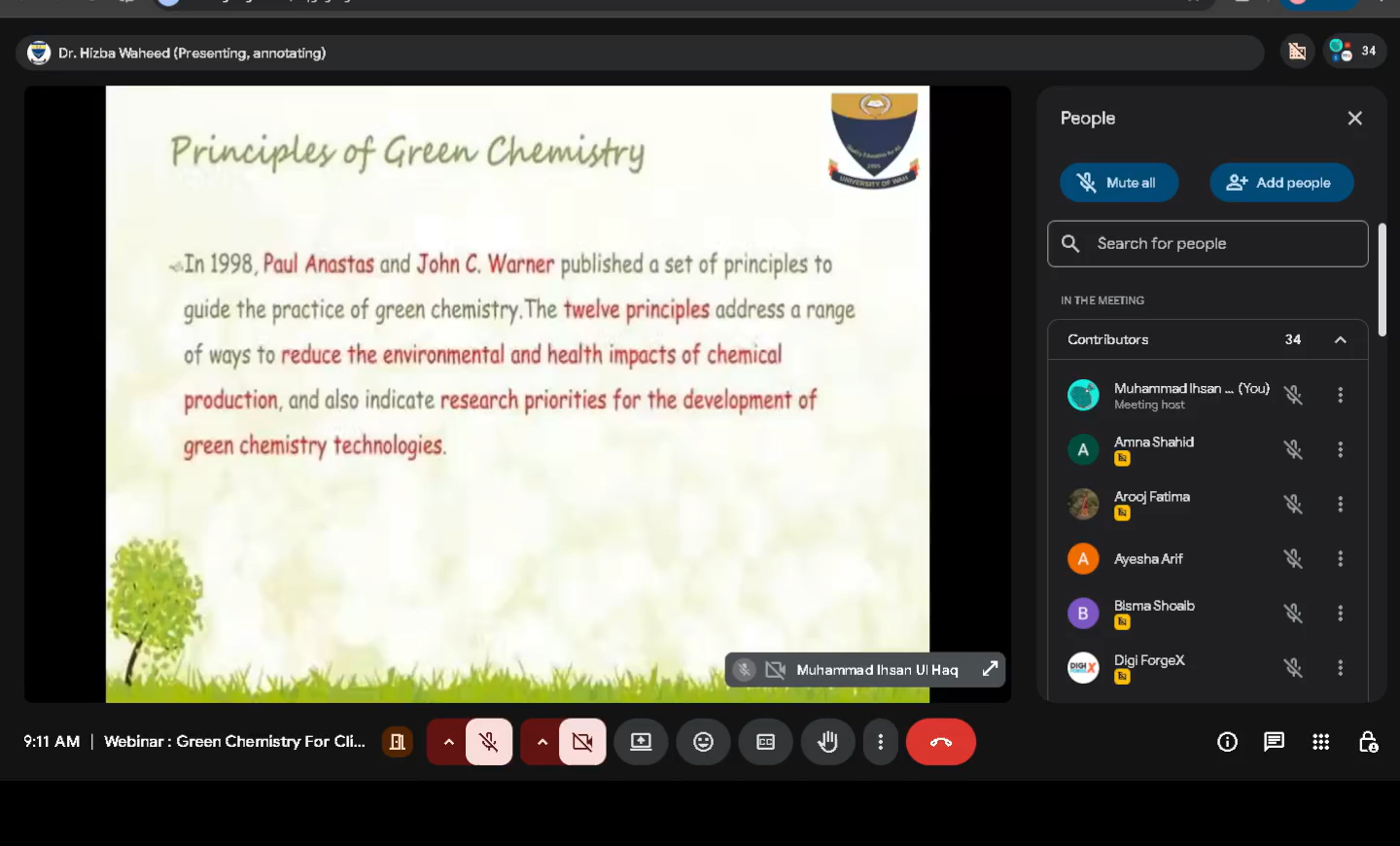 The webinar brought together students, faculty members, and researchers, providing a platform to explore the role of green chemistry in addressing climate change. In her presentation, Dr. Waheed outlined the fundamental concepts of green chemistry and emphasized its importance in reducing environmental hazards through sustainable chemical design and processes.