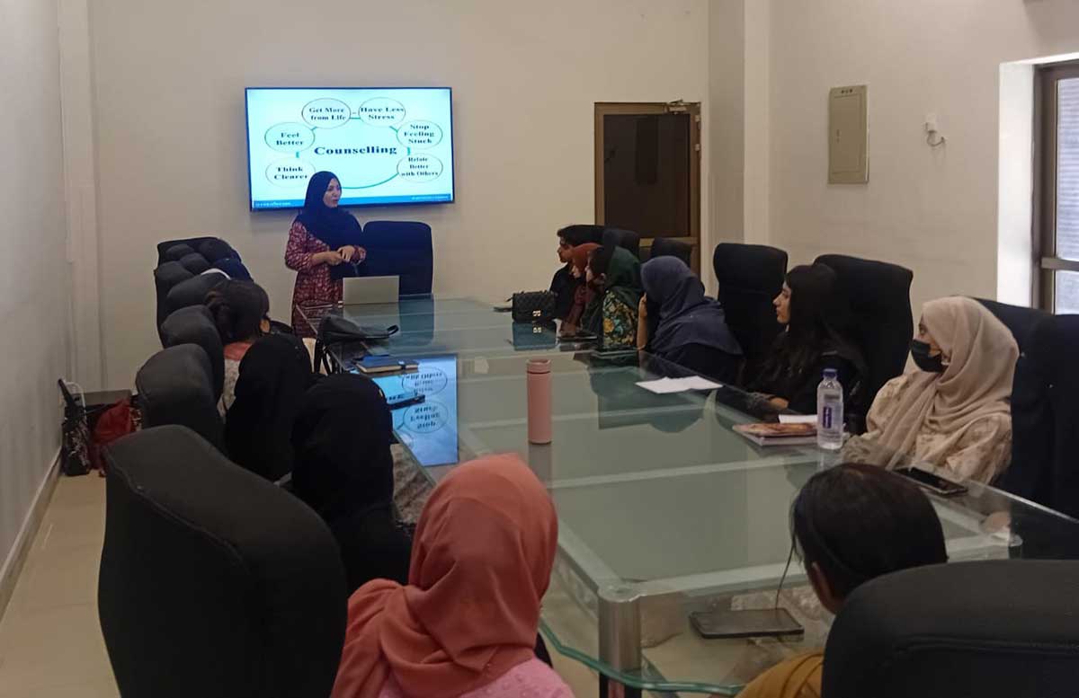 Department of Psychology, University of Wah (UW), conducted an informative and engaging awareness session on Counseling and Mental Health at COMSATS University Islamabad, Wah Campus, on 26 May 2025. The session aimed to educate students on the significance of mental well-being and the support services available to them. Ms. Bibi Hajra, a faculty member and counselor from the Department of Psychology, University of Wah, led the session. With her expertise in the field, Ms. Hajra provided valuable insights into the importance of recognizing mental health issues, managing stress, and seeking timely professional help. Ms. Hajra encouraged students to break the stigma around counseling and highlighted available support services. Students actively engaged in the discussion, making the session informative and impactful. The event is part of UW's ongoing efforts to promote a supportive and mentally healthy environment.