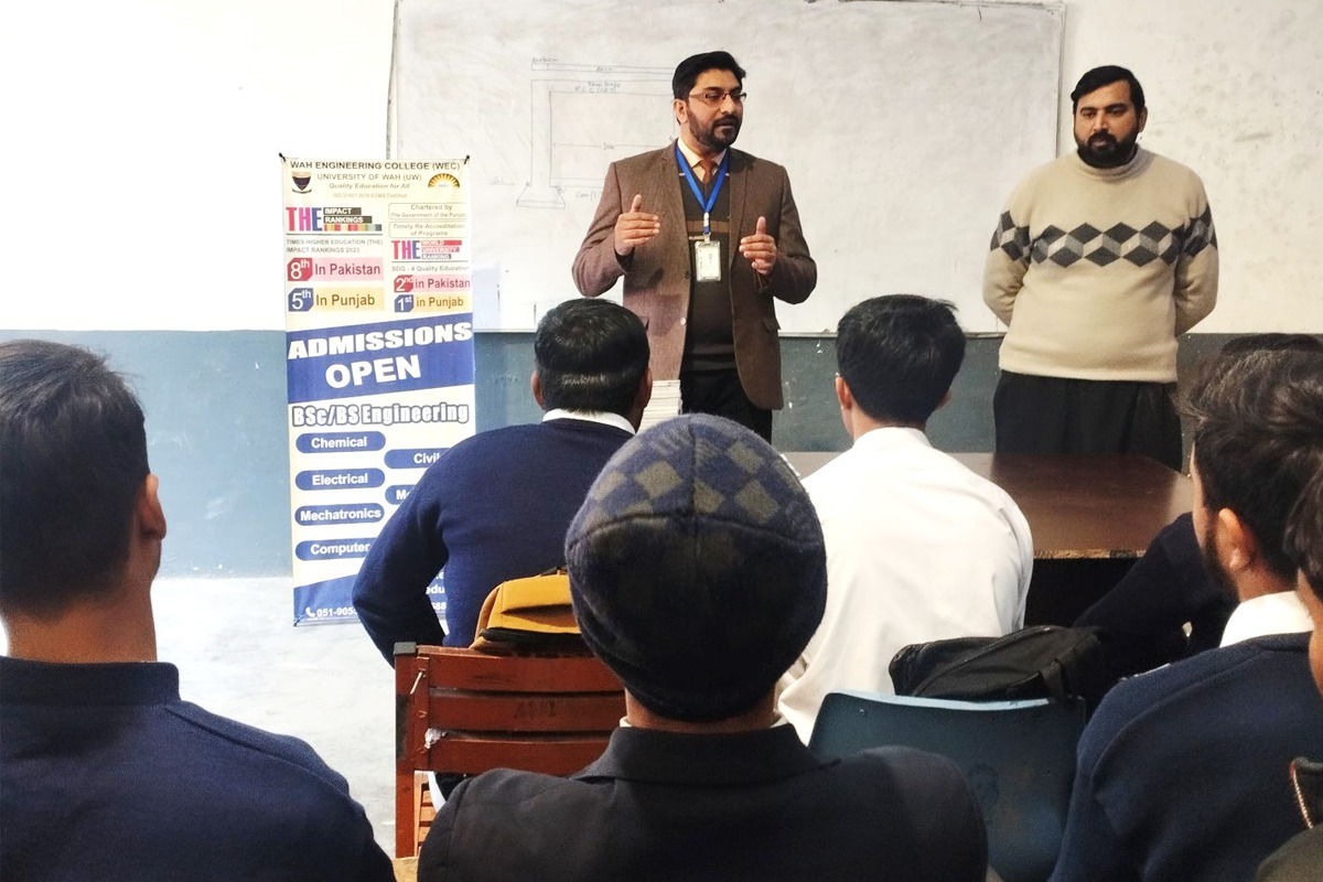 Wah Engineering College (WEC), University of Wah, organized a career counseling session on 10 February 2025 at POF Institute of Technology (POFIT) for final-year DAE Civil students. The session aimed to bridge the gap between academic learning and industry demands, equipping students with essential knowledge and confidence for their future careers. Mr. Muhammad Haroon, Assistant Professor, Civil Engineering Department, conducted the session and provided insights into the latest technological advancements in civil engineering and career prospects in the construction industry. Emphasizing the impact of emerging technologies, Mr. Haroon highlighted the significance of WEC for higher education and professional growth.