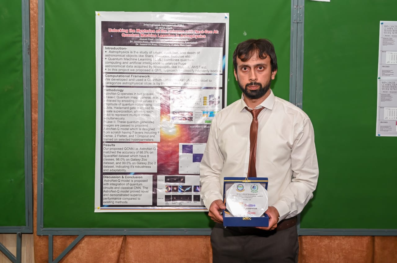 University of Wah is delighted to announce that Mr. Ahmad Rauf, a Ph.D. scholar from the Department of Physics, under the supervision of Prof. Dr. Jameel-Un Nabi and co-supervision of Dr. Javeria Amin, has won 1st Prize in the Poster Competition at the 1st International Symposium on “AI Horizons: Revolutionizing Interdisciplinary Frontiers & Ethical Implications,” held on 13 May 2025 at Rawalpindi Women University, Rawalpindi. The symposium was organized by the Office of Research, Innovation, and Commercialization (ORIC) at Rawalpindi Women University, in collaboration with HEC Pakistan.